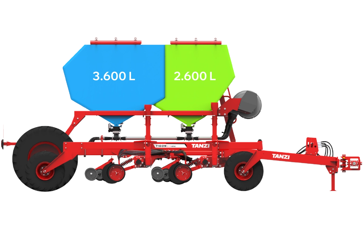 Tigon Gen 2 cuenta con una impresionante capacidad de insumos de 6.000 Litros y 2 compartimentos. Los mismos pueden utilizarse indistintamente para semillas o fertilizantes.