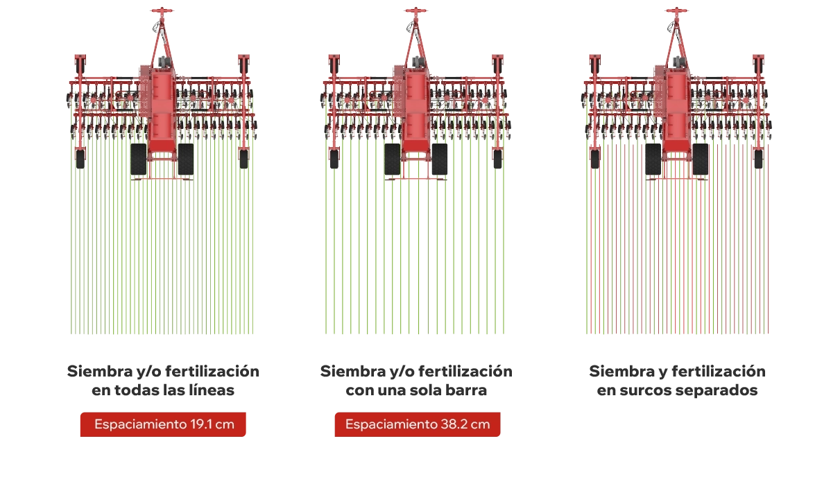 A su vez, las mismas pueden operar de forma independiente; o sea, al bajar una sola barra se puede sembrar a 38.2 cm. de espaciamiento y al bajar ambas barras sembrar a 19.1 cm. de espaciamiento.