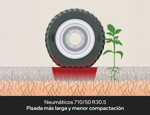 Tigon Gen 2 incorpora neumáticos radiales de gran tamaño 710/50 R30.5, diseñados para distribuir el peso de una manera mucho más uniforme, reduciendo de esta forma la presión sobre el suelo. El resultado es un suelo más sano, con mejor estructura y mayor capacidad productiva a largo plazo, en línea con los principios de la agricultura regenerativa.